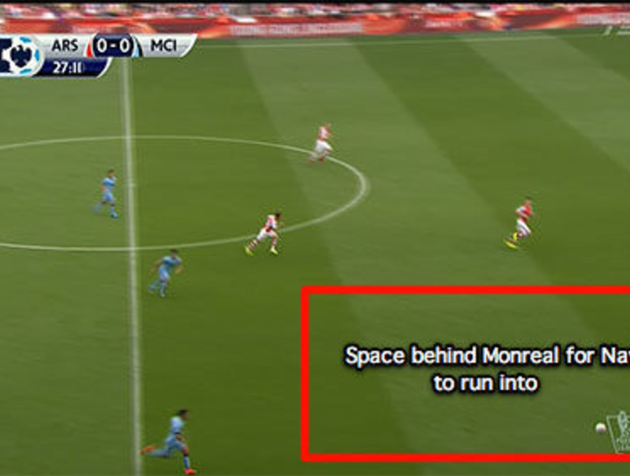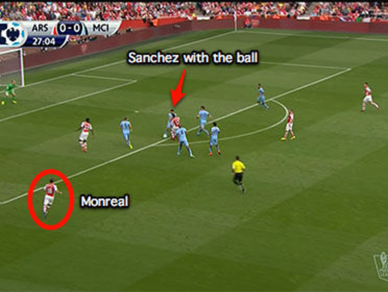When Sanchez is tackled, the ball pops out to the halfway line, where Mathieu Flamini, also at fault in this sequence, is unable to win it cleanly against Sergio Aguero. His attempted slide tackle results in the ball ricocheting into the area vacated by Monreal, allowing Jesus Navas to use his pace, keep it in play and run into the acres of space in front of him.