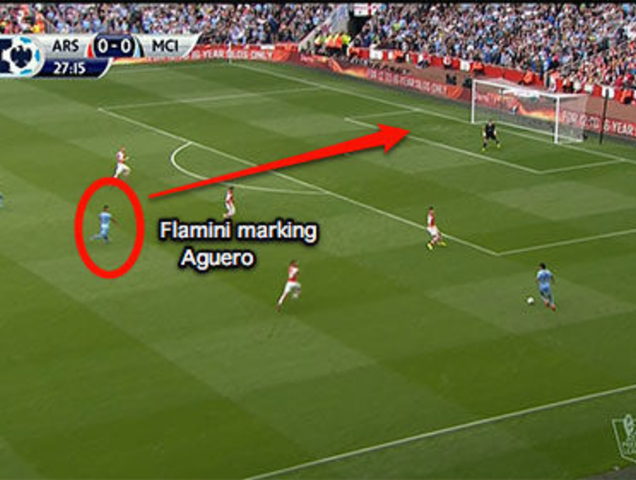Despite City breaking at pace, Arsenal are still in good defensive position at this point. Aaron Ramsey and Laurent Koscielny are converging on the ball carrier (Navas), while Flamini is marking Aguero in the middle. If the Frenchman were to stay between Aguero and his own goal, he would be able to effectively clear any ball played into the penalty area.