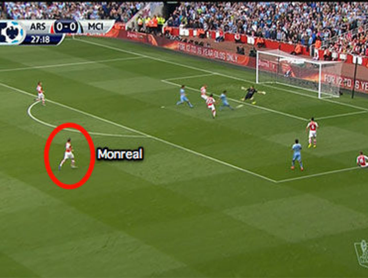 Aguero is able to get behind him and slot the ball beyond 'keeper Wojciech Szczęsny. Just for fun, take a look at where Monreal is at the time of the goal.