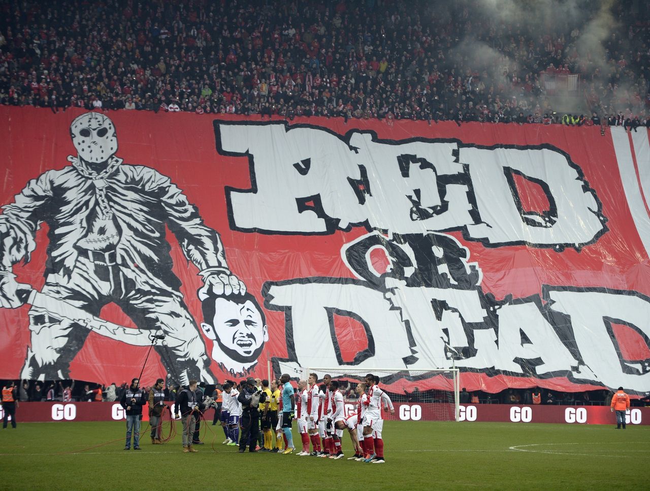 The banner, which said "Red or Dead," referenced the club's colours and branded Defour - who once played for Standard Liege - a traitor for signing with the club's greatest rival. As seen above, the drawing shows a masked character, who seems to be Jason Voorhees of "Friday the 13th," holding Defour's decapitated head.