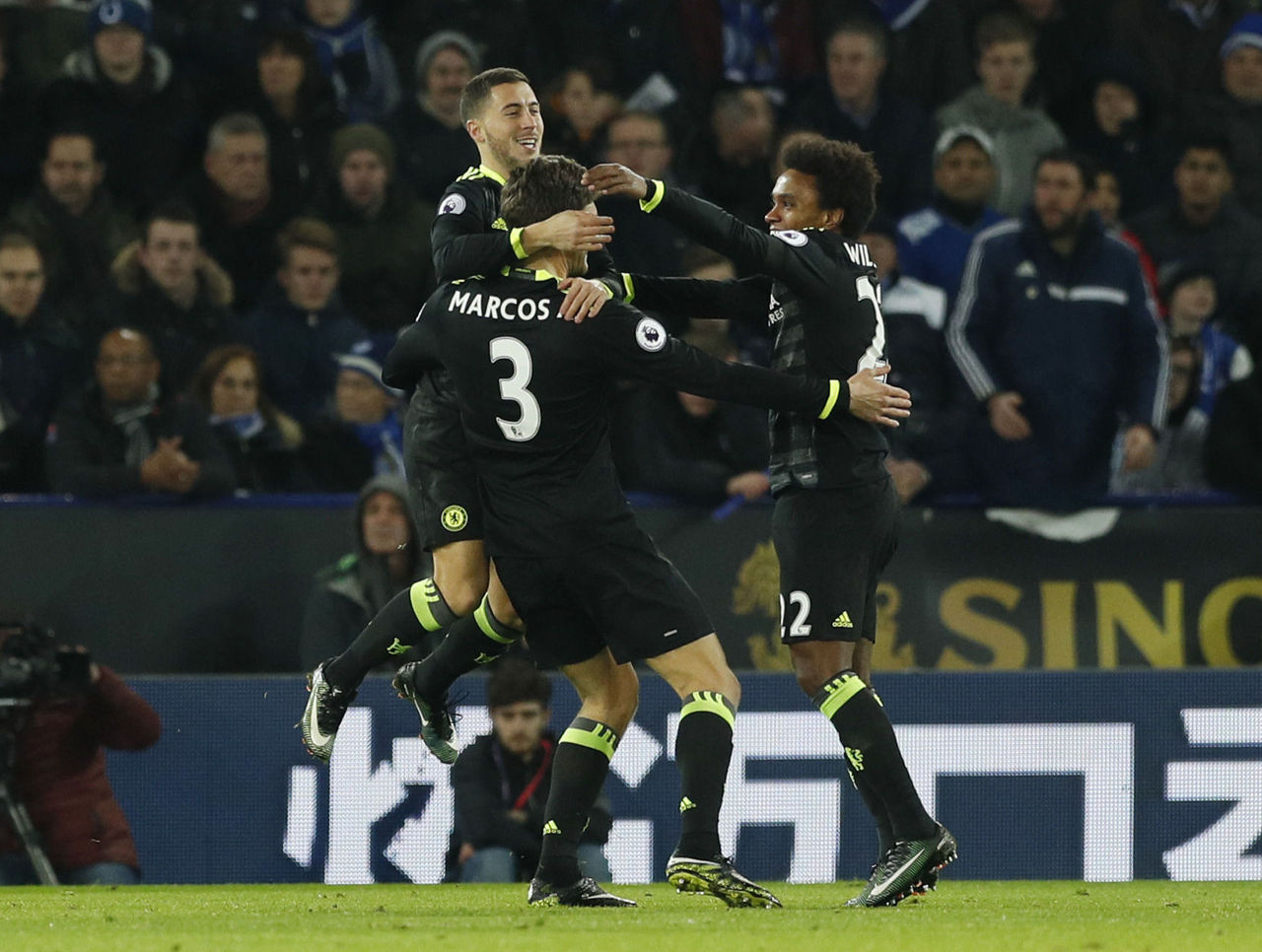 Again on Saturday, the 26-year-old was influential and calm when chaos descended upon him. Take a look at Marcos Alonso's opening goal: As the ball bobbled around in front of Leicester goalkeeper Kasper Schmeichel, Hazard simply slotted it to the vacant Spaniard.