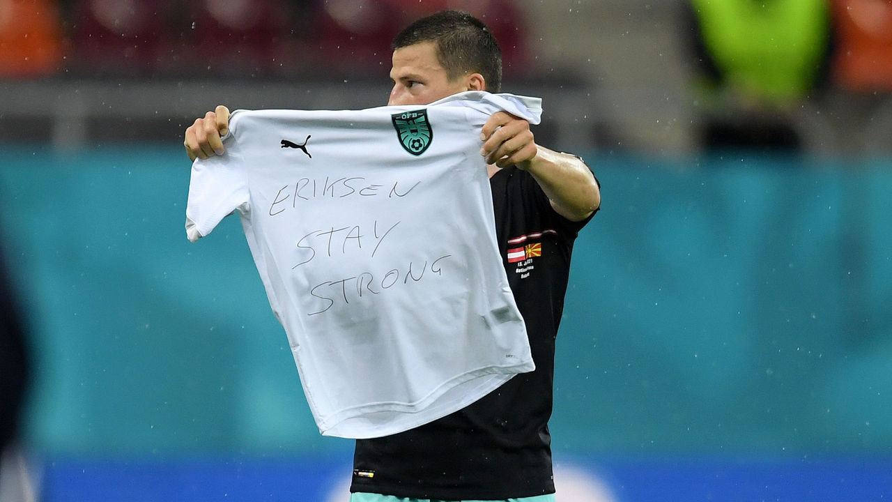 He held a shirt up - "Eriksen Stay Strong" - to join the worldwide tributes to Danish playmaker Christian Eriksen.