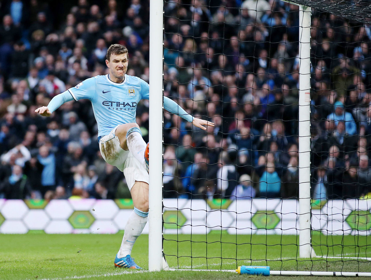 After the miss, Dzeko decided to take out his frustration on the poor, innocent goal post.