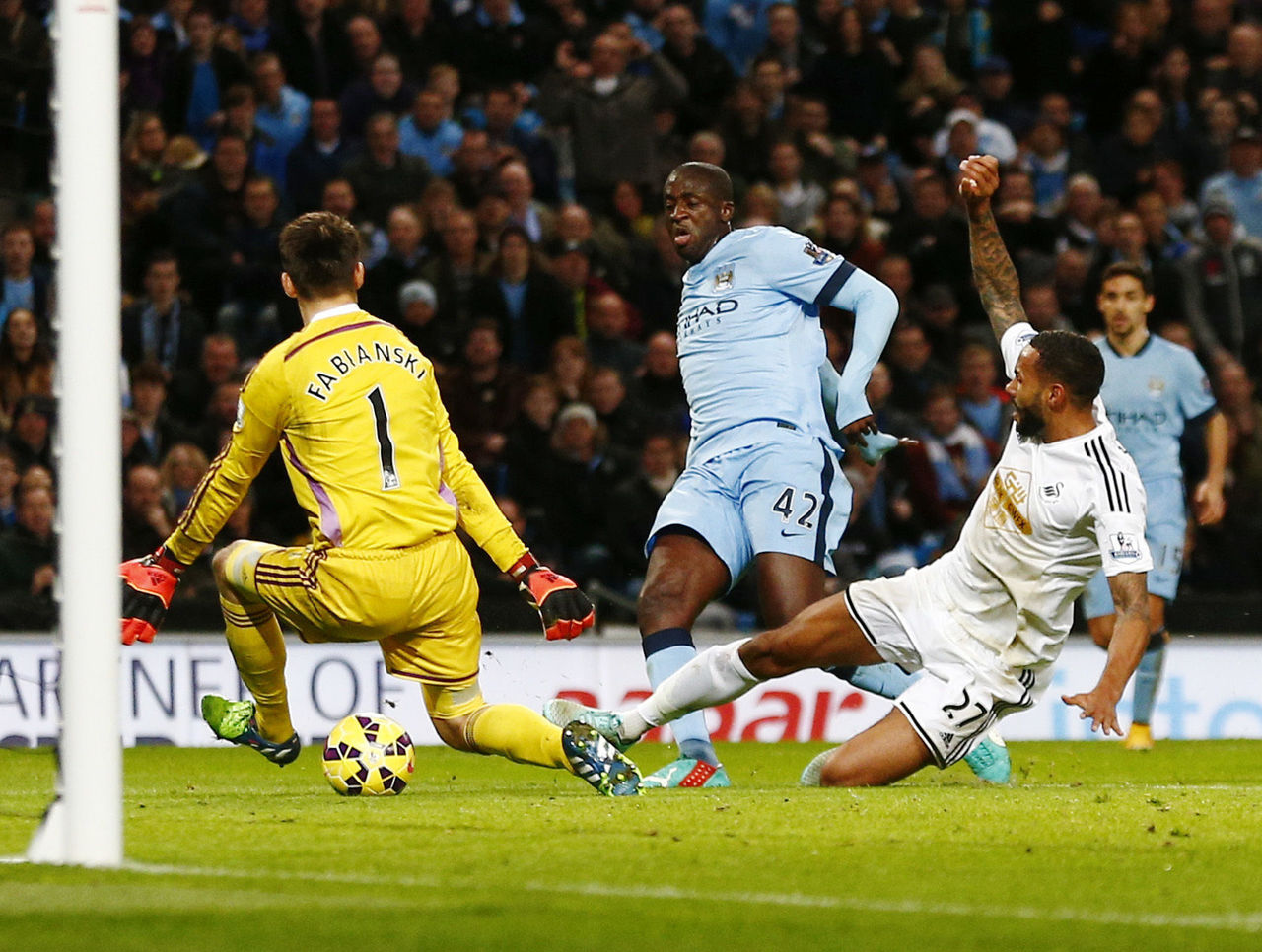 City dominated possession in this one and finally broke through in the second half when Toure's surging run through the Swansea defence saw the Ivorian connect with Fernandinho's backheel into the box and smack the ball past the 'keeper for the game-winning goal.