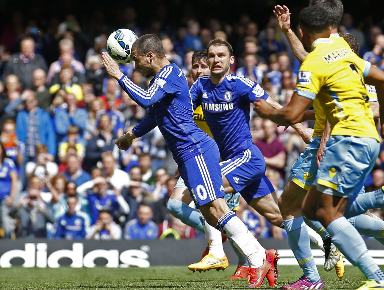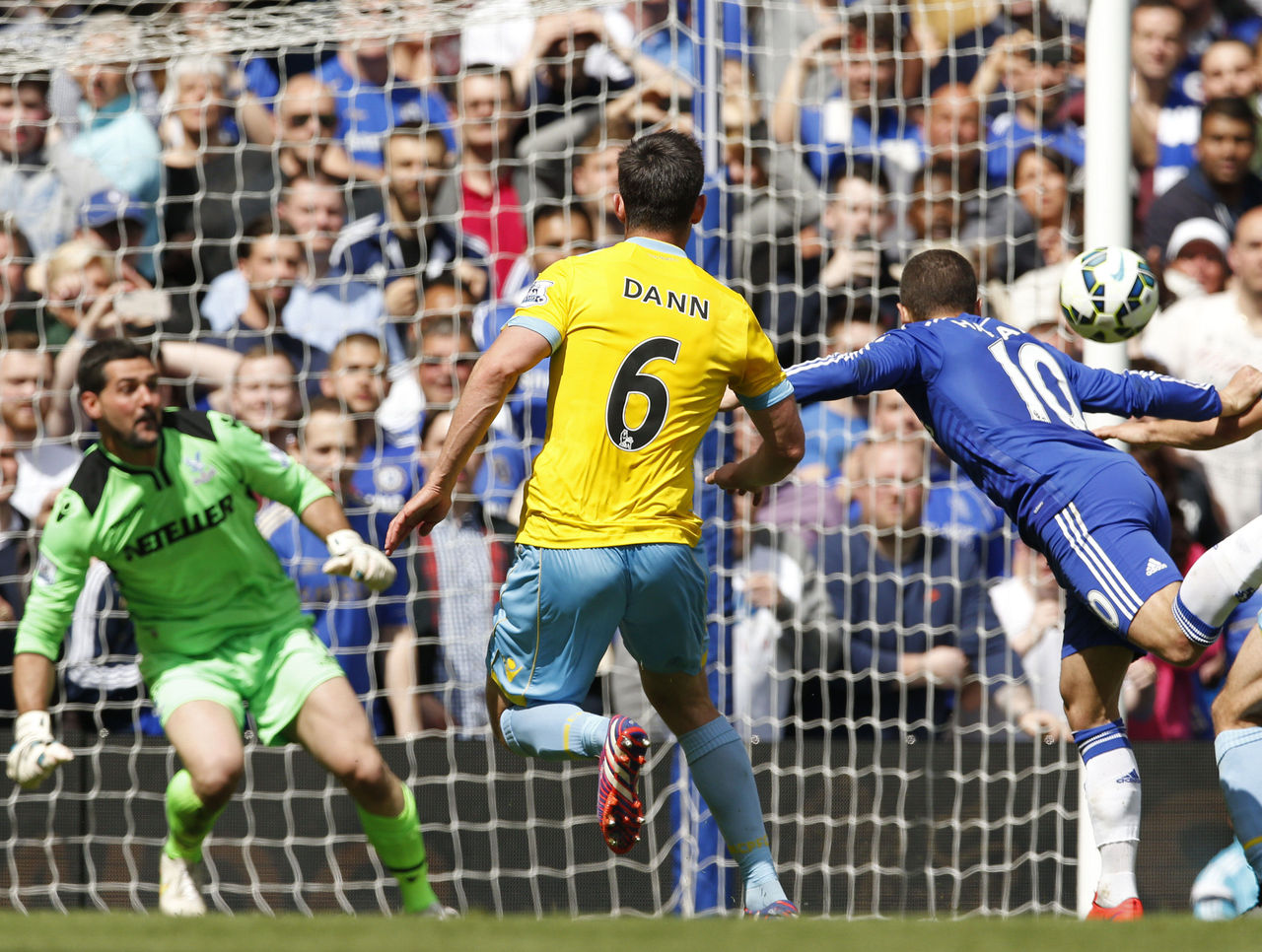 PFA Player of the Year, Eden Hazard breaks the deadlock moments before halftime by heading his missed penalty past the helpless Crystal Palace 'keeper Julian Speroni.