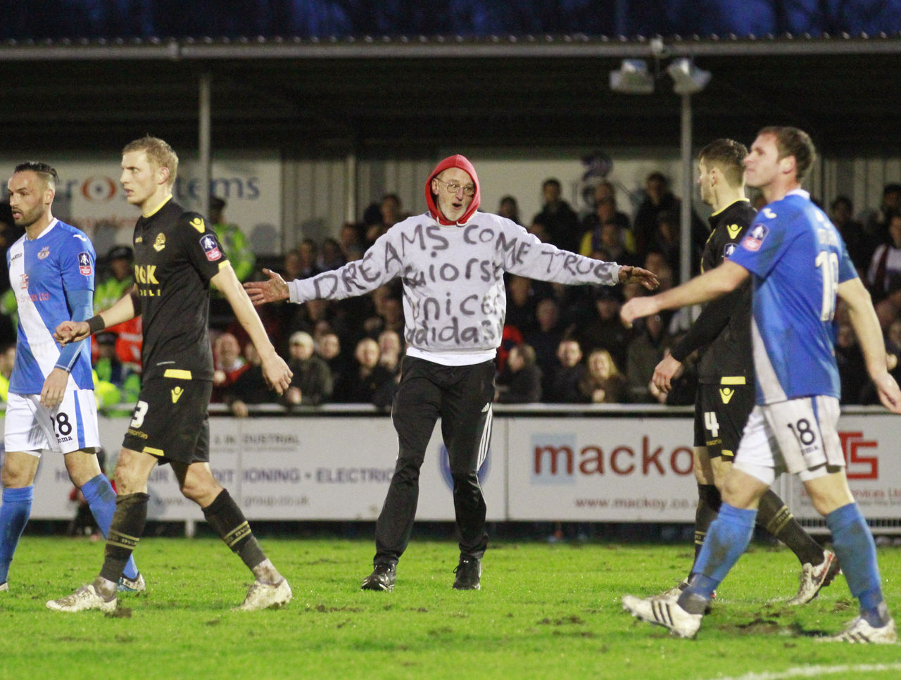 Not only was this Eastleigh pitch invader a couple of strides short of scoring a tap-in before slipping over, this great pace and clever movement came from the legs of a rather seasoned spectator.