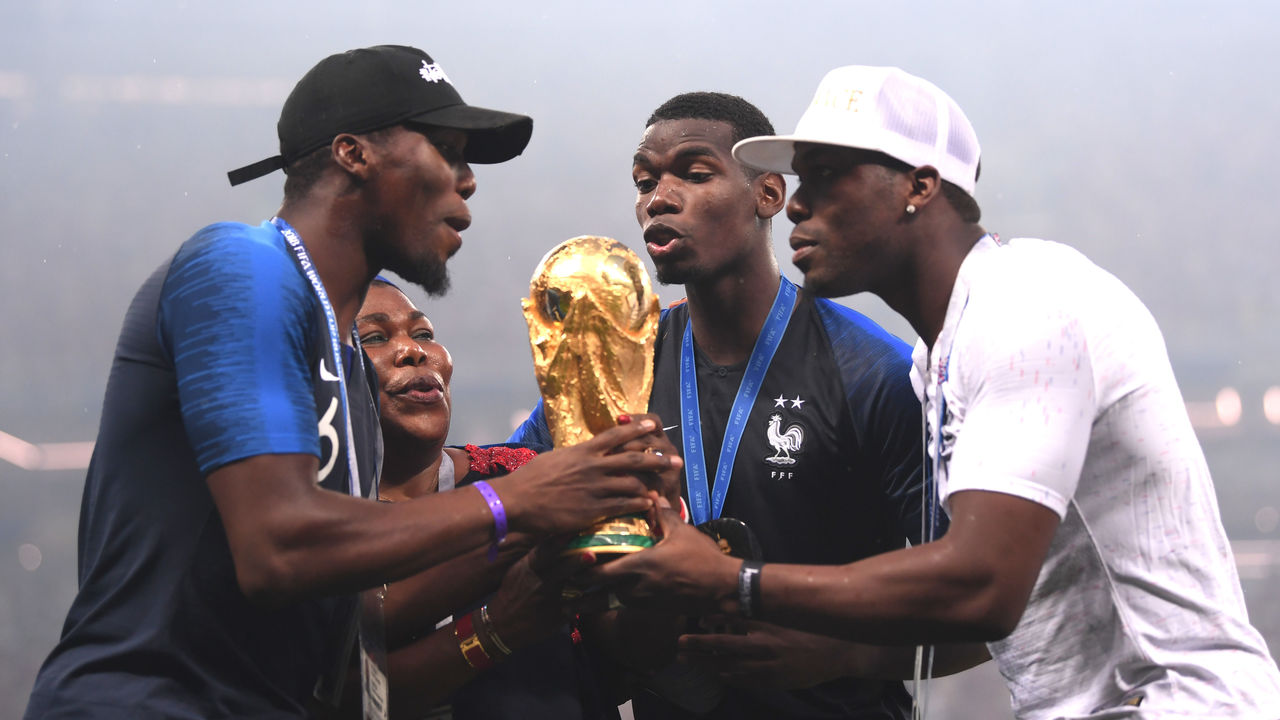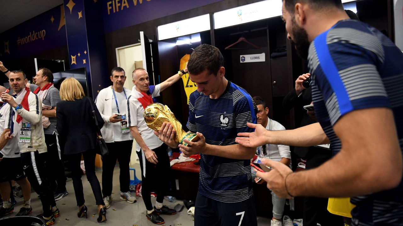 As the rain poured down, the victorious French players collected their medals, hugged the country's president, Emmanuel Macron, and finally got a hold of the World Cup trophy.
