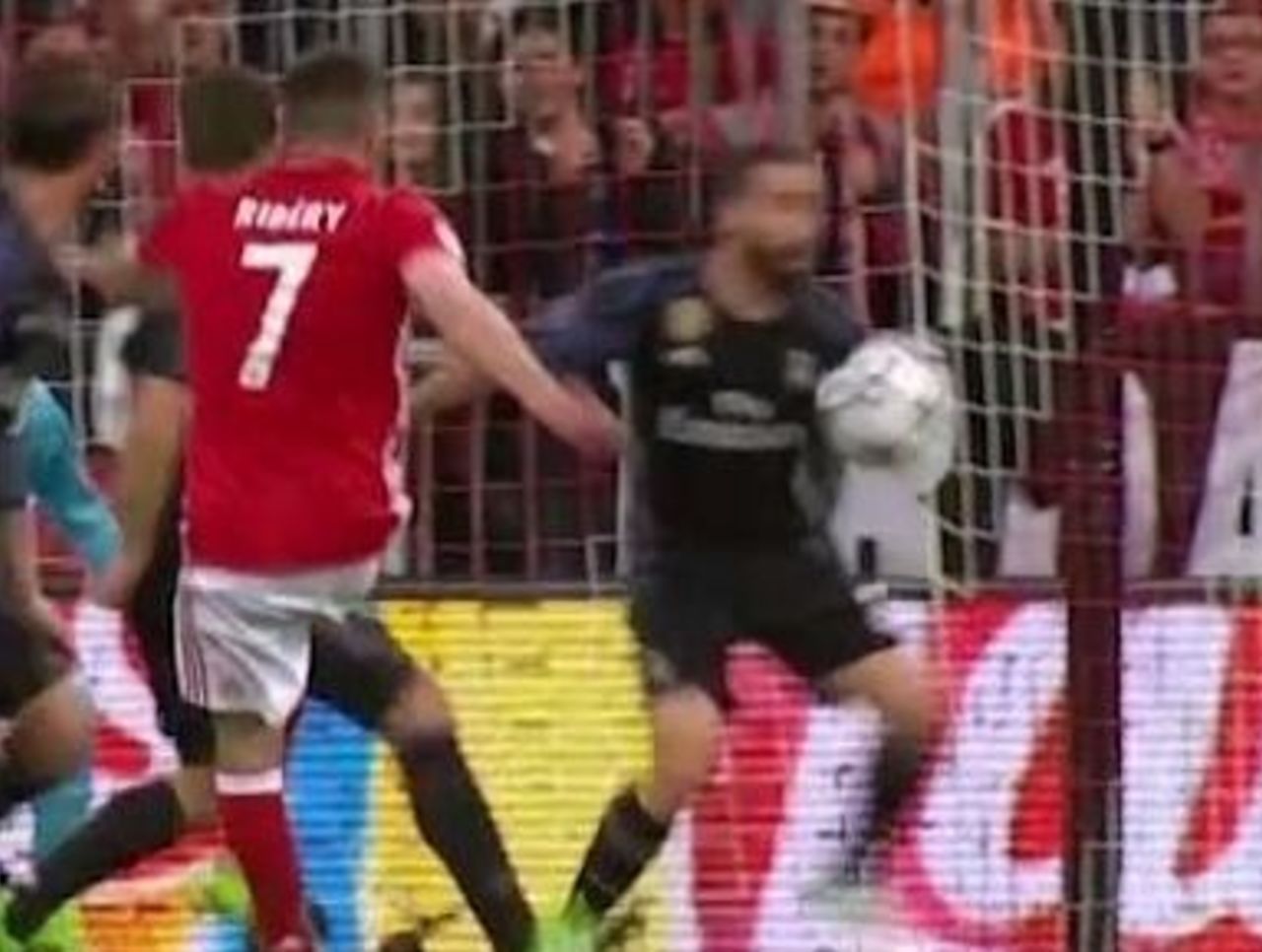 Carvajal very clearly parries Franck Ribery's shot away with his shoulder, though after conferring with the fourth official, referee Nicola Rizzoli sees it differently and calls Real for the foul.