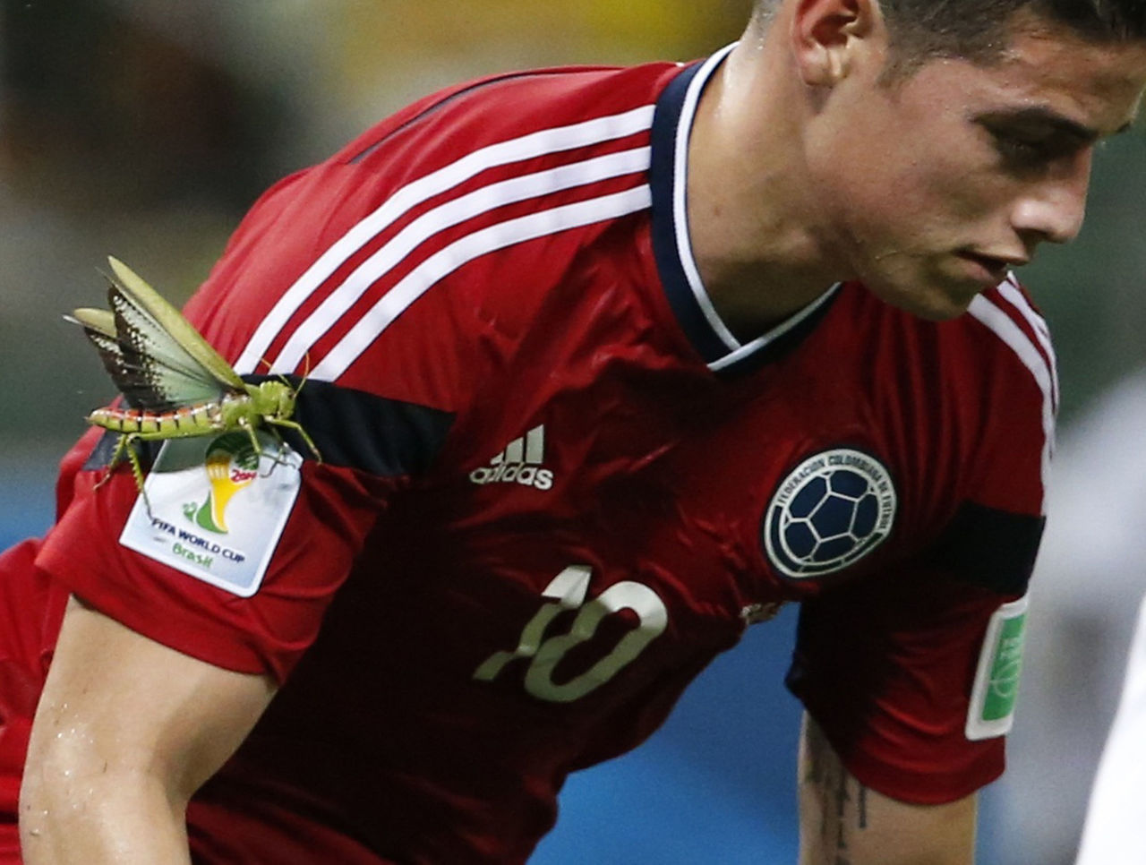 In one of the more unusual moments of the World Cup, a massive insect, which appears to be a katydid, landed on James Rodriguez during Colombia's 2-1 quarterfinal loss to Brazil.
