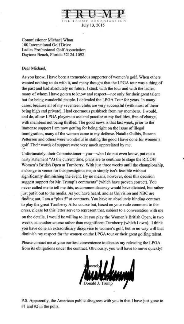 You have an absolutely binding contract to play the great Turnberry Ailsa course but, based on your rude comment to the press, please let this letter serve to represent that, subject to a conversation with me on the details, I would be willing to let you play the Women's British Open in two weeks, at another course rather than magnificent Turnberry (which I own). I think you have done an extraordinary disservice to women's golf, but in no way will that diminish my respect for the women on the LPGA tour or their great golfing talent.