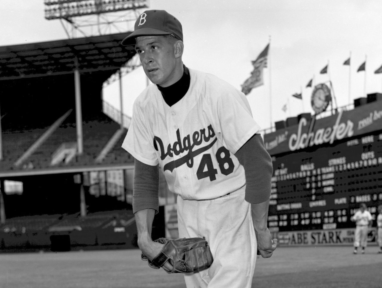 One year before a a young left-hander named Sanford Koufax made his Dodgers debut, the club was fixated on another precocious southpaw by the name of Karl Spooner, who joined the club in September of 1954 and was hailed as a future superstar shortly after arriving in Brooklyn. Though the Dodgers had been eliminated from the pennant race, Spooner dazzled the 3,256 fans who poured into Ebbets Field on Sept. 22, 1954, lifting his club to a 3-0 victory over the New York Giants by fanning 15 in a complete-game shutout. Four days later, when the Pittsburgh Pirates came to Brooklyn to close out the regular season, Spooner was superb once again, tossing another complete-game shutout with a dozen strikeouts in a 1-0 victory to finish his first week in the majors 2-0 with a 0.00 ERA, 0.72 WHIP, and 39.7 percent strikeout rate in 18 innings.