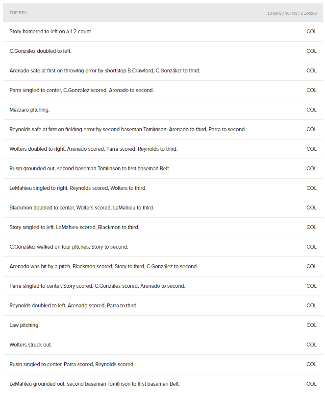 - The Rockies' outburst shattered their previous record of 12 runs in an inning, which was established back on July 30, 2010 in a 17-2 drubbing of the Chicago Cubs at Coors Field.