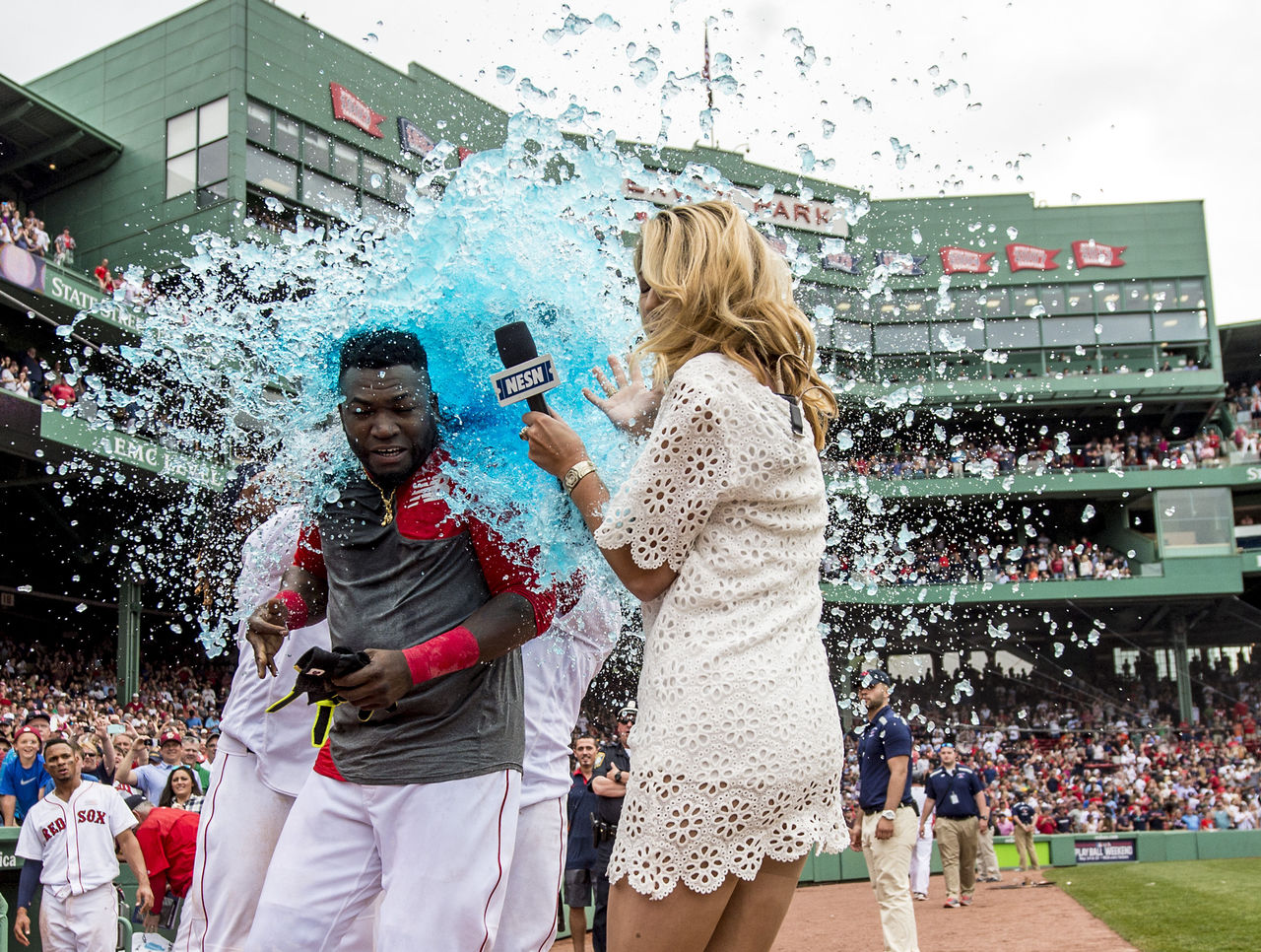 This was a Powerade shower for two. Ortiz was given the obligatory splash, while NESN sideline reporter Guerin Austin also got drenched in the celebrations.
