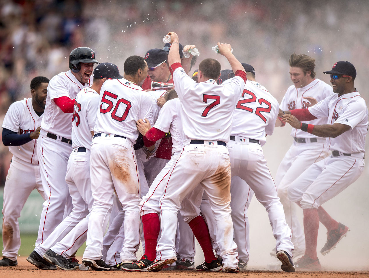The celebration mimicked that of a World Series win. Teammates sprinted to Ortiz and mobbed him at second base as a cloud of rosin and sunflower seeds surrounded them.