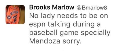 "The Houston Astros do not condone the tweet posted by one of our minor league players earlier this evening," the team said in a statement. "We have communicated with the player, who agreed that his tweet was inappropriate and insensitive and has since apologized. We also apologize to Ms. Mendoza, who is an outstanding broadcaster that we have had the pleasure of working with this season."