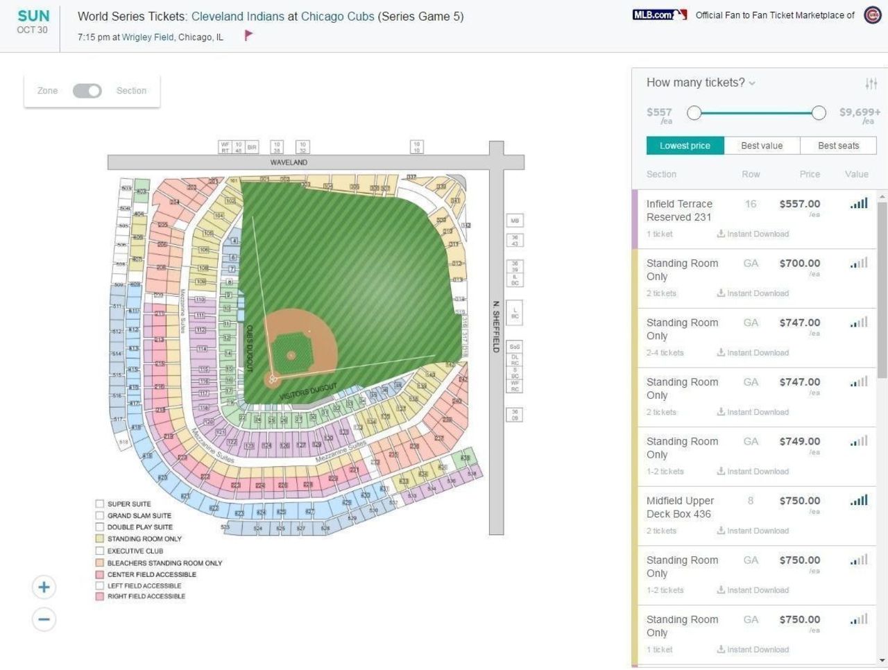 As of early Sunday morning, the cheapest single ticket available for Game 5 on Stubhub, the preeminent re-sale site, was going for $557 (Infield Terrace Reserved 231, Row 16), while the cheapest pair of standing room tickets were set at $700 apiece.