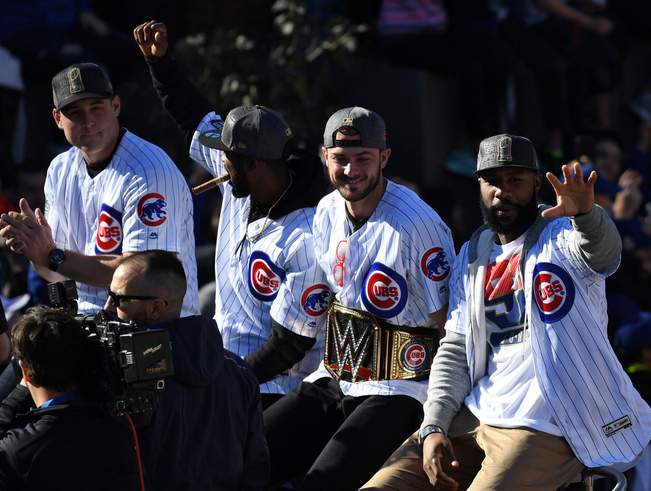 Kris Bryant dons the WWE Championship belt that Triple H gave the Cubs.
