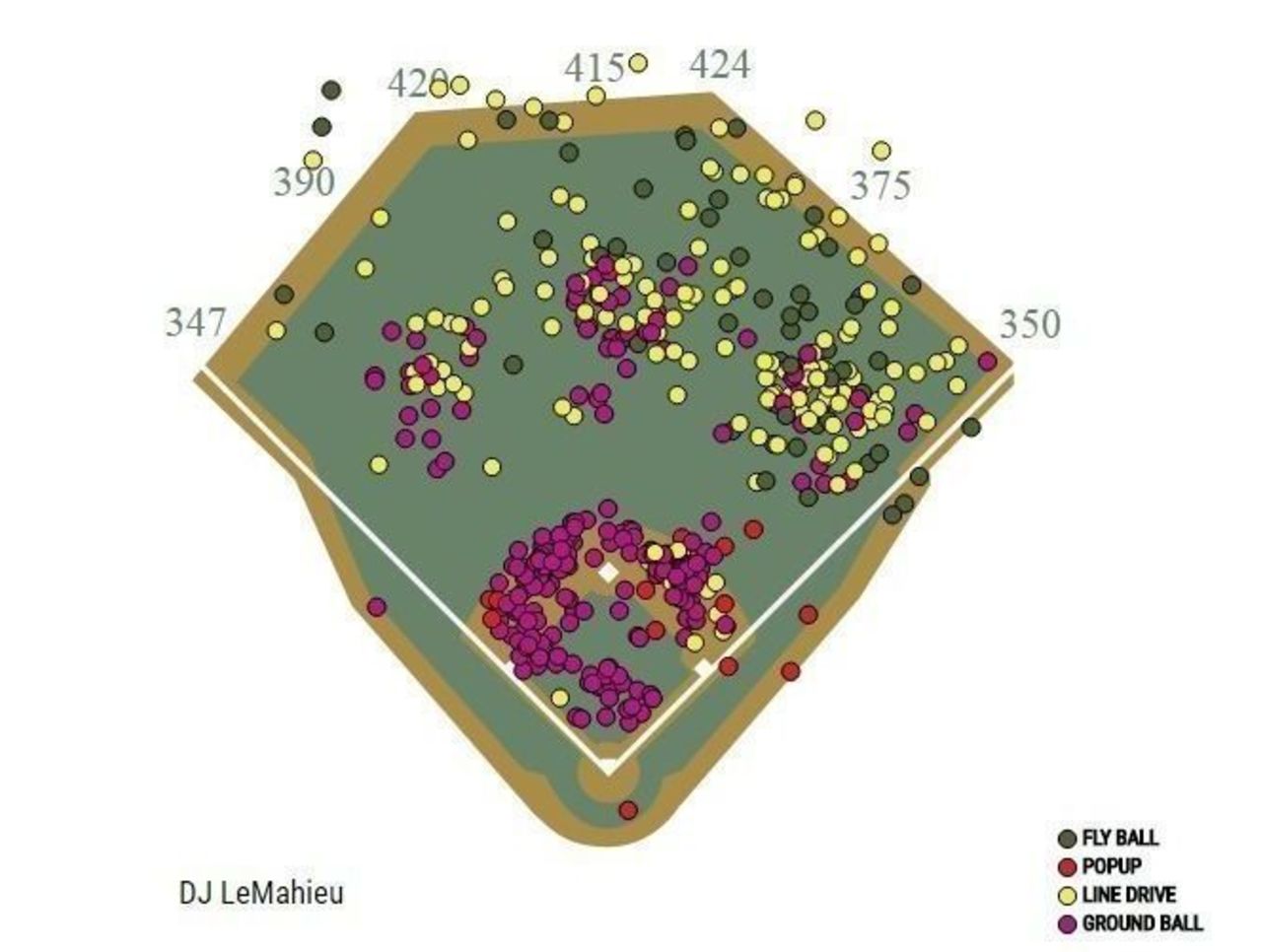 The batted balls to look at the most when evaluating a shift are mostly the fly balls, though line drives should factor in slightly as well. And, apart from a couple outliers down the left-field line, LeMahieu does seem to spray the outfield almost exclusively to center and to right. It's a pretty noteworthy spray chart for a right-handed batter to have.