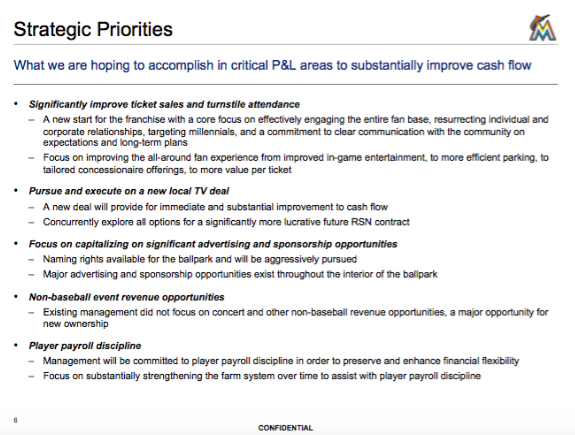 It doesn't appear, however, that obtaining additional investment would deter the Marlins from going through with that widely expected rebuild. In the teaser email distributed to prospective investors, the Marlins characterized their situation as a "rebuilding period," and stressed the management will be "committed to player payroll discipline," with a focus on "substantially strengthening the farm system."