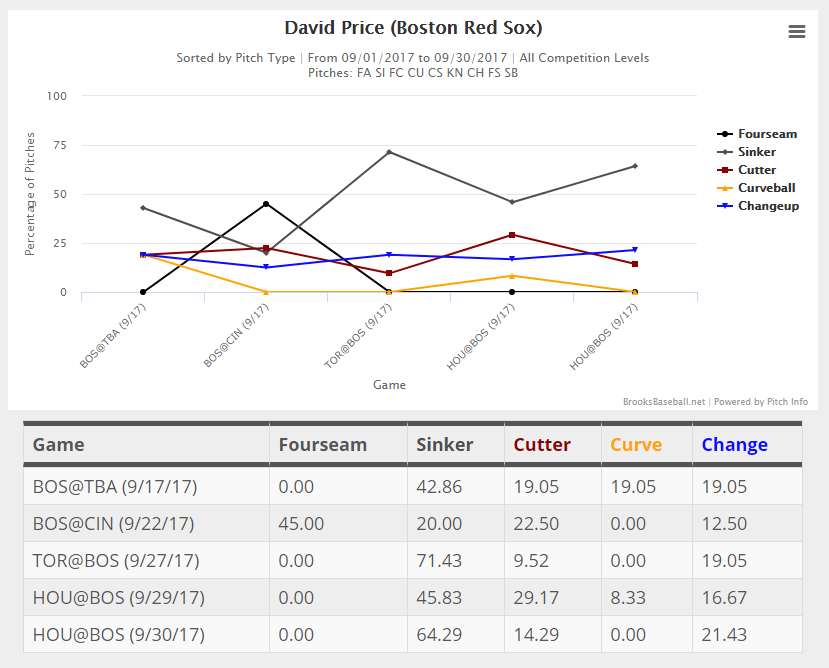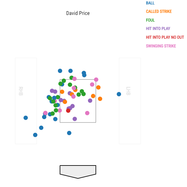 Gone are the days when Price could reach back and blow a hitter away with velocity - his four-seamer has topped out at 94.5 mph this year - but his arsenal of distinct fastballs has always made him difficult to barrel up, and Price is embracing that more than ever, from the looks of it. (He really got into frustrating hitters with divergent fastballs in September, when he was bumped to the bullpen following an eight-week stint on the disabled list due to renewed elbow trouble and all but ditched his four-seamer.)