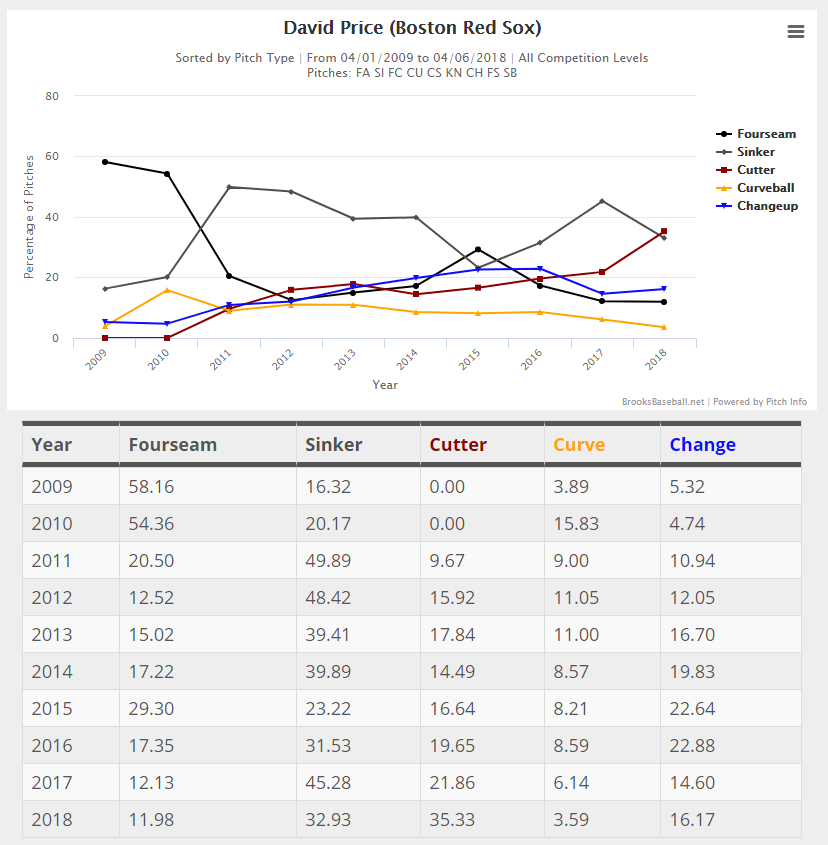 Across his first two turns through the rotation in 2018, Price's reliance on his cutter has been unprecedented, with the offering accounting for 35.3 percent of the pitches he's thrown so far. Price's cutter usage has been steadily increasing over the past few years, likely in response to his slowly waning velocity, but it's now his go-to pitch for the first time ever.