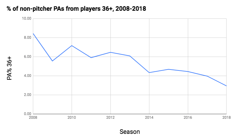Mauer, after all, is considerably older than each of those first basemen, save for Gonzalez (whose disastrous platform season makes him a lousy comparison, too), making him a less likely investment as baseball's decision-makers continue to devalue players on the back nine of their thirties, so to speak. Through the first two-thirds of the 2018 campaign, after all, position players age 36 or older have accounted for only 2.95 percent of all plate appearances, a roughly 5.5 percent drop-off from a decade ago.