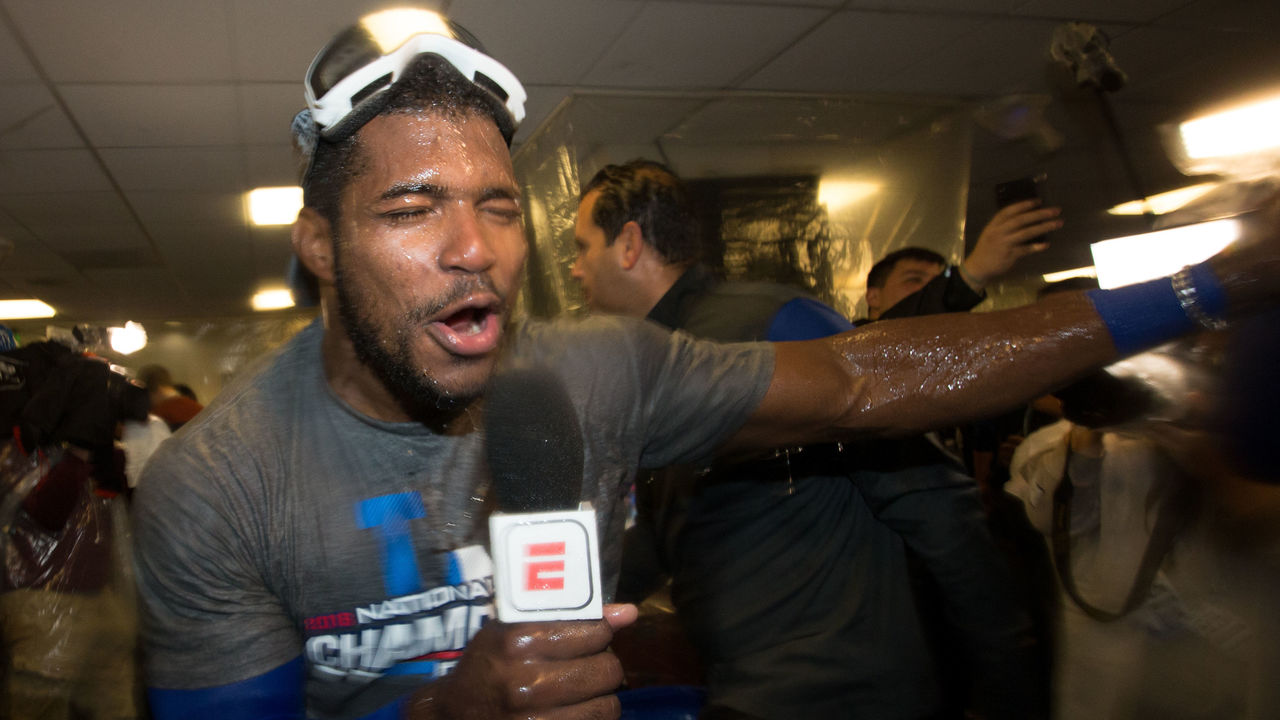 Not only did the star outfielder dump a barrel full of ice on Enrique Rojas during the celebration, but he also stole the reporter's mic to conduct his own segment on ESPN.