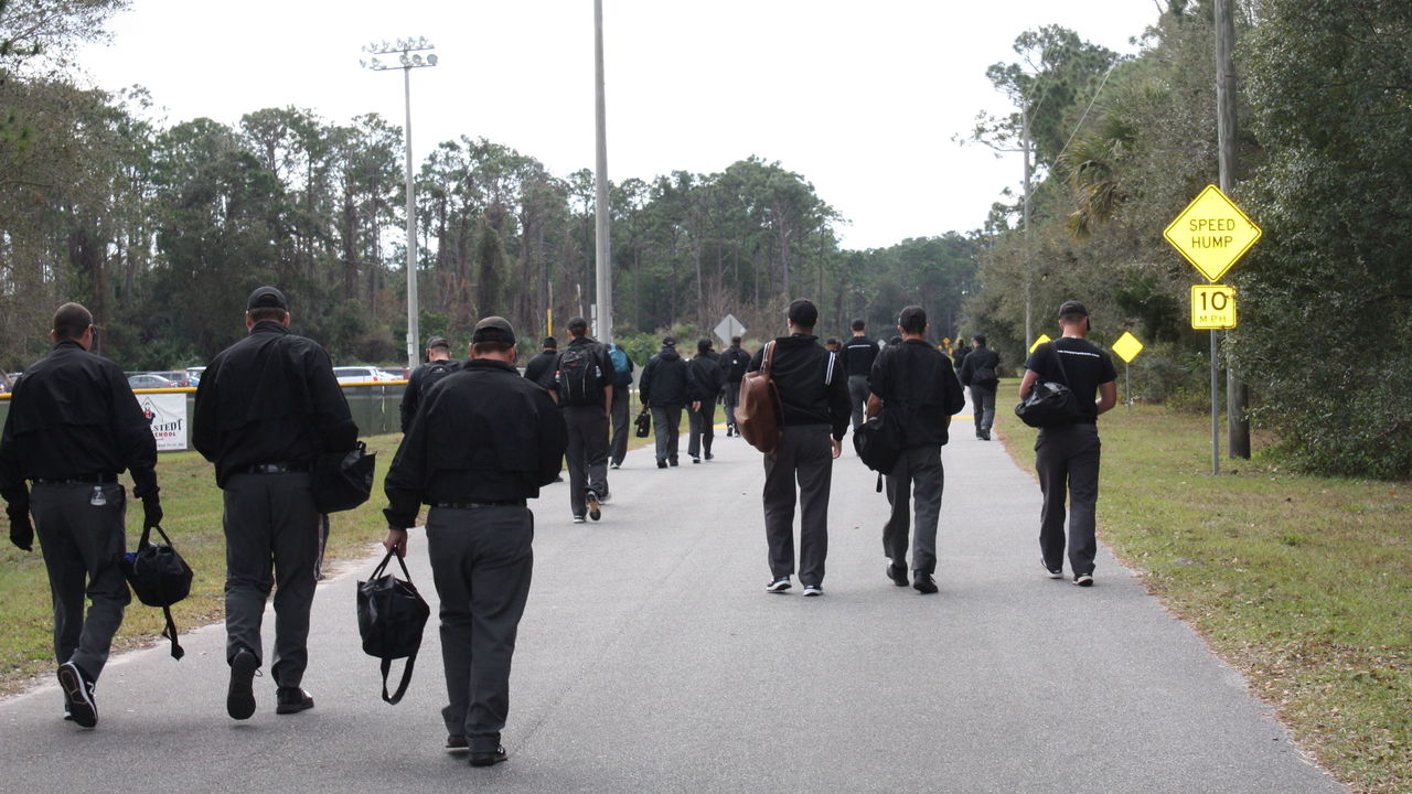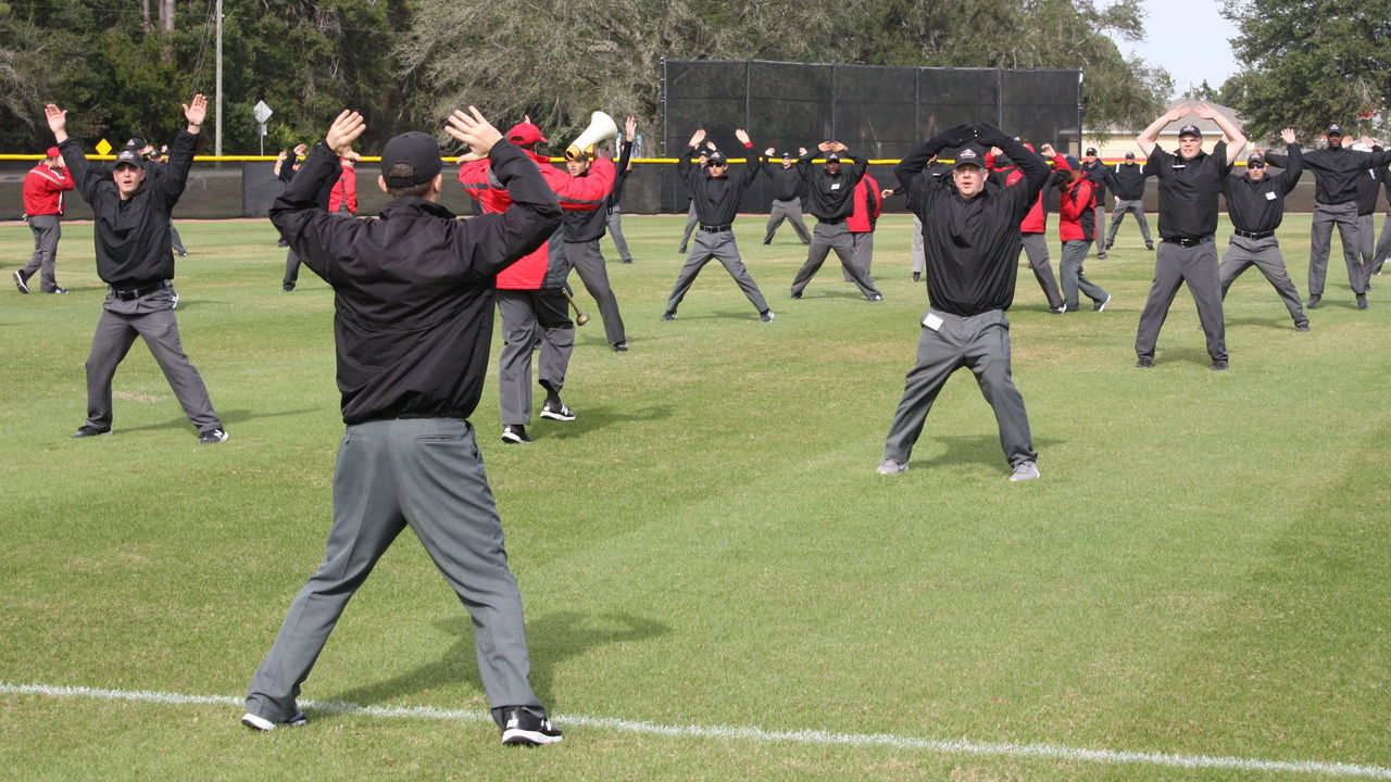 Class usually adjourns just before noon, at which point students meander to the baseball diamonds down the road. Twice a day, they line up in the outfield for formation, in which they work on their umpiring mechanics - strike calls on a right-handed batter, ball calls on a left-handed batter, out, safe, time - and try to avoid the wrath of the exercise's bullhorn-wielding instructor. Never is the sense of fraternity in camp more palpable than when all 89 students scream "He's out!" in unison, their accompanying right-hand signals perfectly in sync.