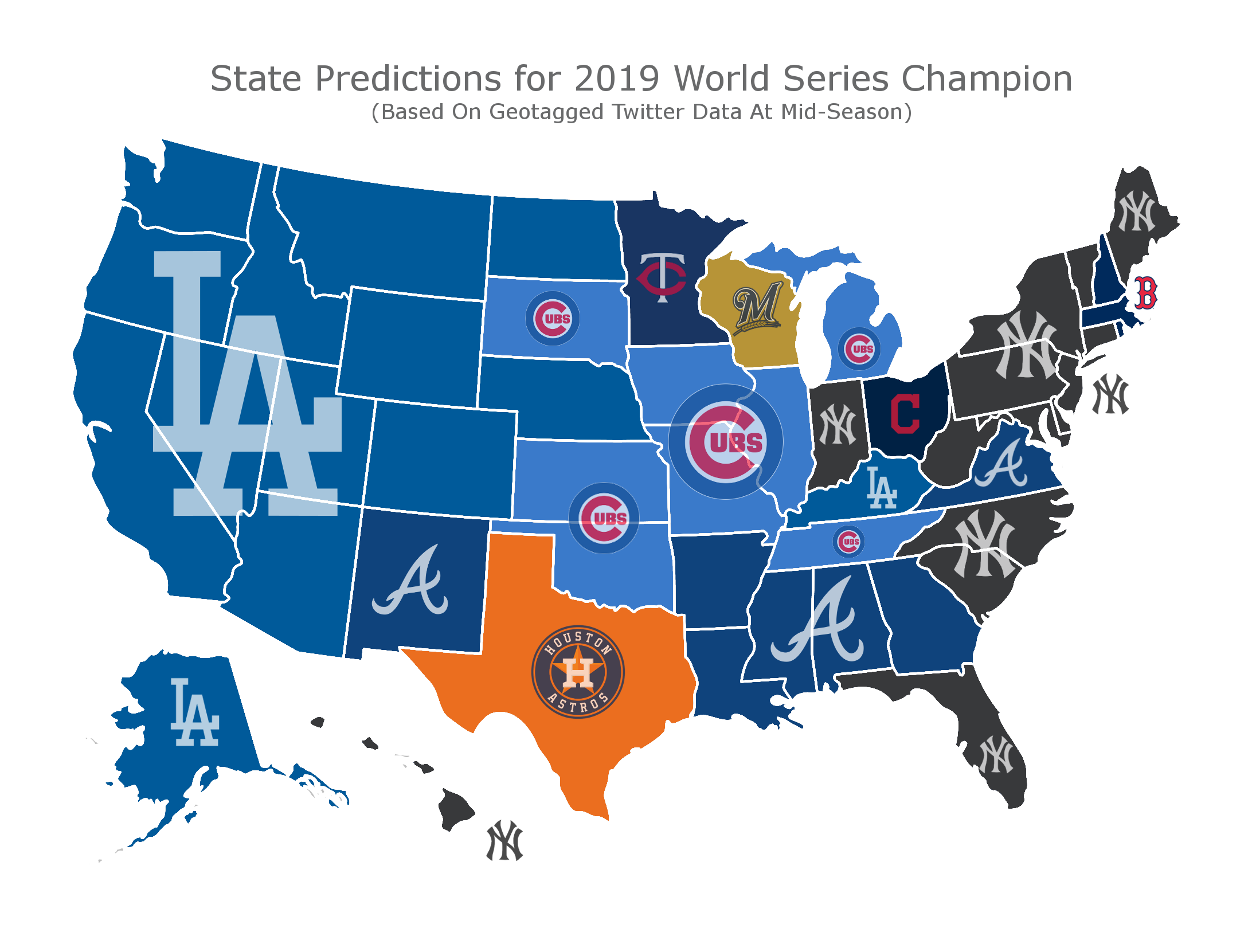 Most of the United States believes the 2019 World Series winner will be either the New York Yankees or Los Angeles Dodgers, according to a new Twitter map.