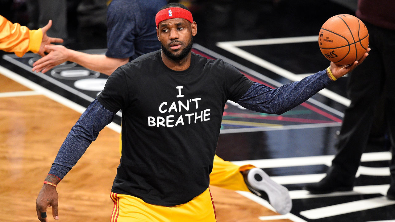 James, Derrick Rose, Kyrie Irving, and other NBA players warmed up in "I Can't Breathe" T-shirts to recognize the family of Eric Garner, the New York man who died after an officer placed him in a chokehold; and