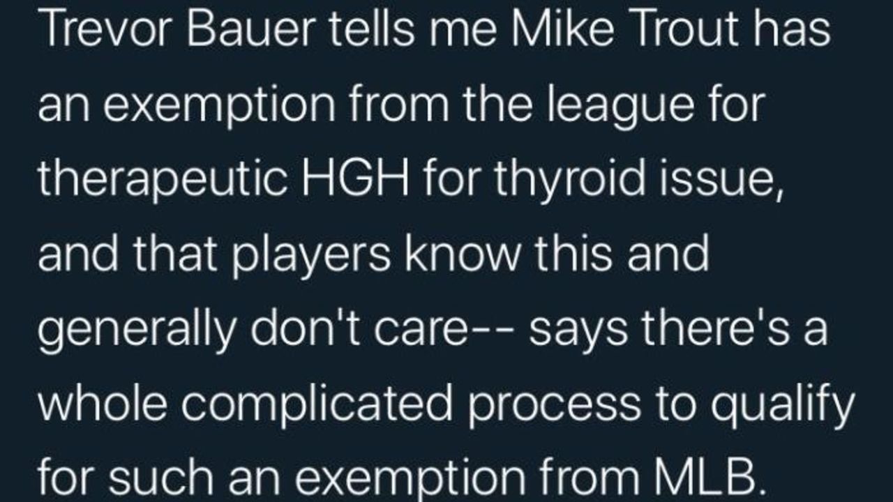 Bauer confirmed in a tweet that he has no knowledge of Trout's "specific situation" but did discuss the possibility of him using a therapeutic usage exemption.