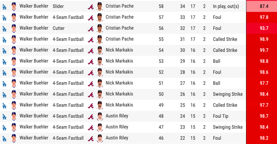 With the bases loaded in the top of the second and nobody out, Buehler - staked an early 3-0 lead - decided to dispense with mixing pitches and relied almost exclusively on his four-seamer, which batters mustered just a .165 weighted on-base average (and .199 xwOBA) off of this season. The strategy worked. Buehler proceeded to retire the next three batters in order, notching successive strikeouts and an inning-ending grounder via a torrent of four-seamers - 11 in a 13-pitch span, none of them clocked below 97.7 mph - to keep Atlanta off the board.