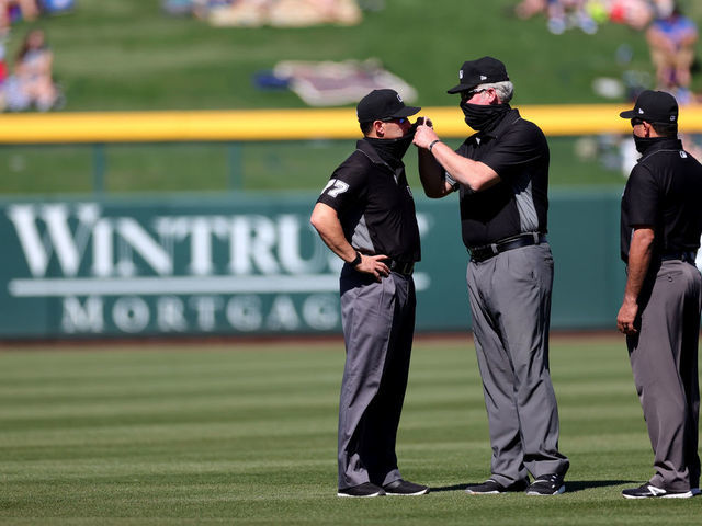 Without anyone to call balls and strikes, Cleveland's catcher Beau Taylor took over umpiring duties while squatting behind home plate.
