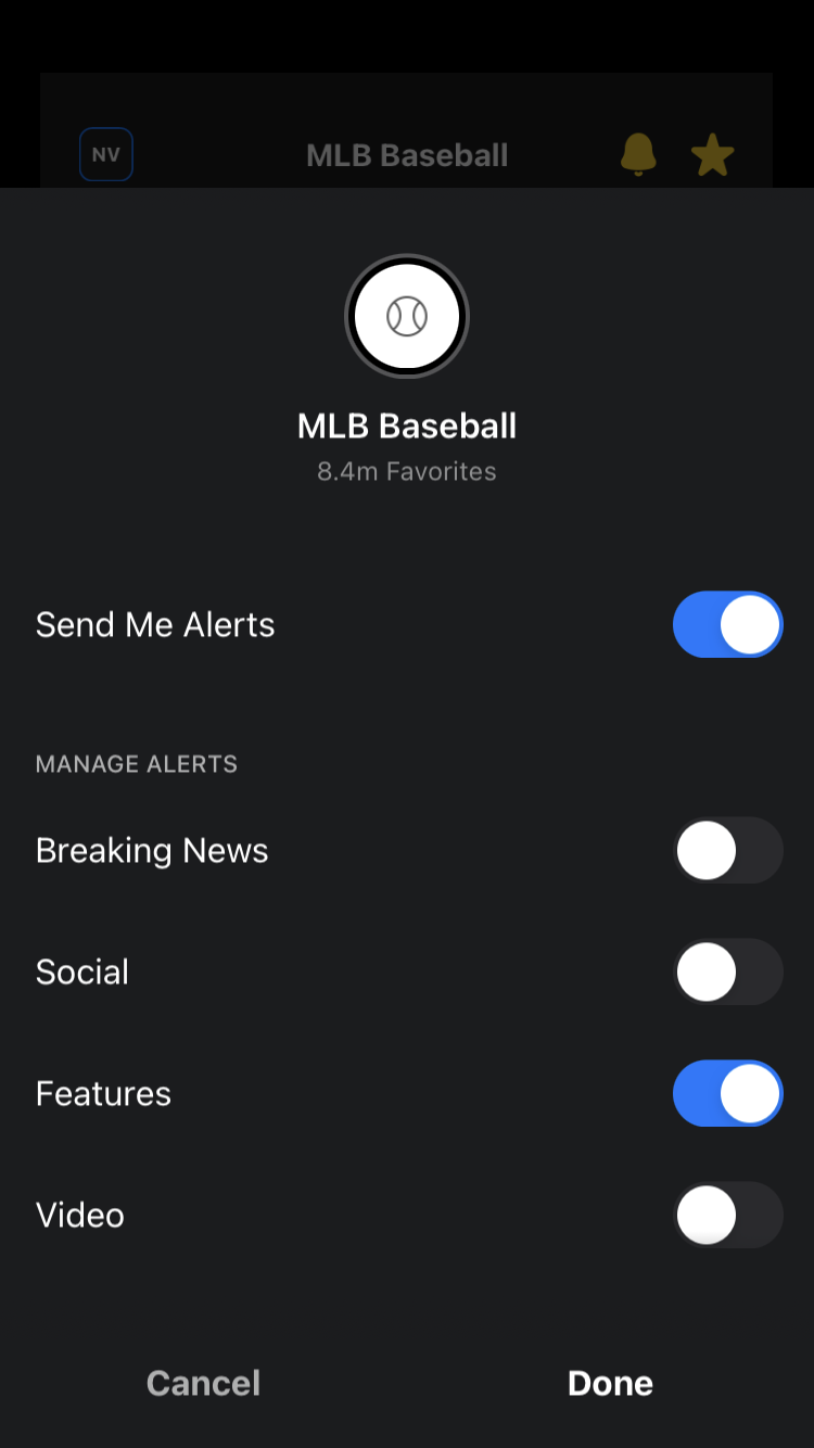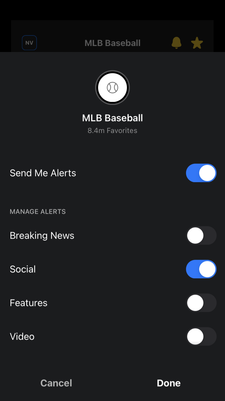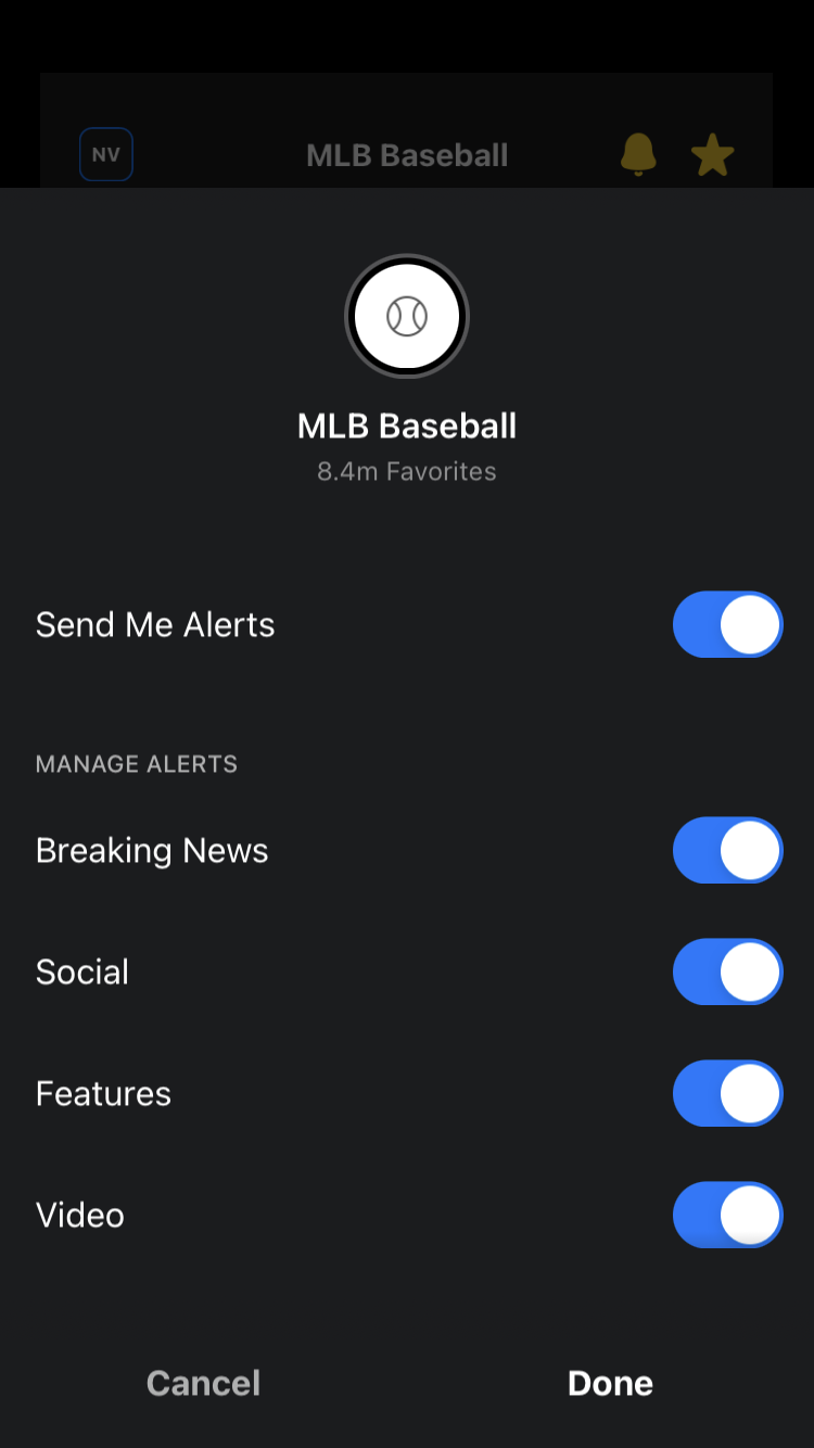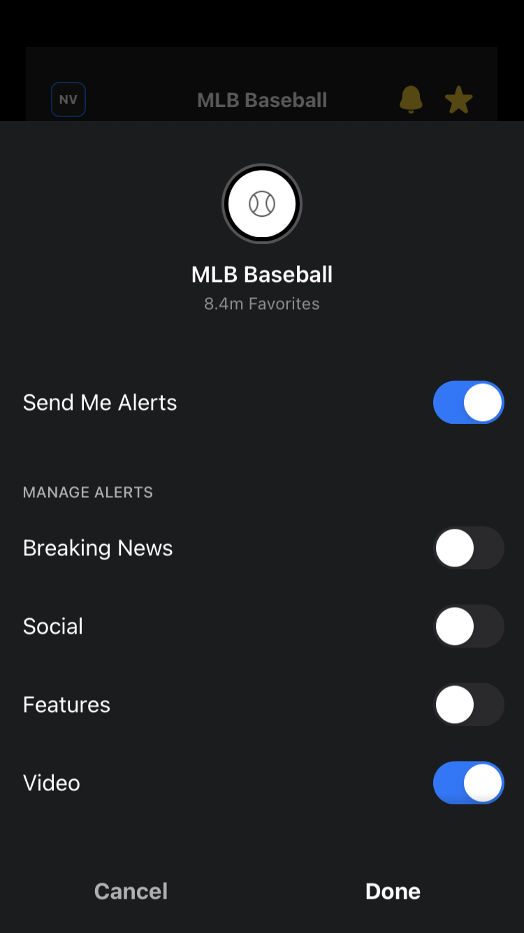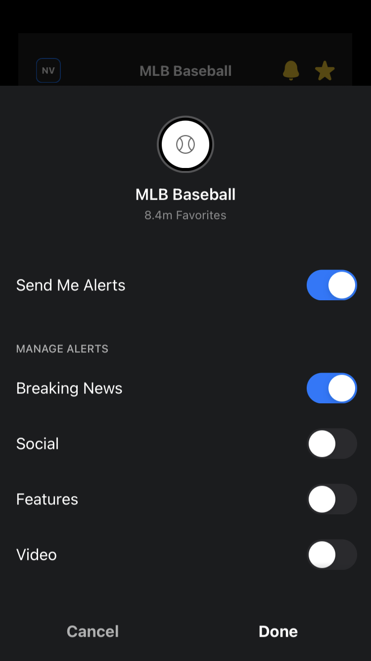 By subscribing to MLB push alerts, you'll be in the loop on everything baseball, and you can do so by tapping on the ⭐ in the top right-hand corner of the MLB section:
