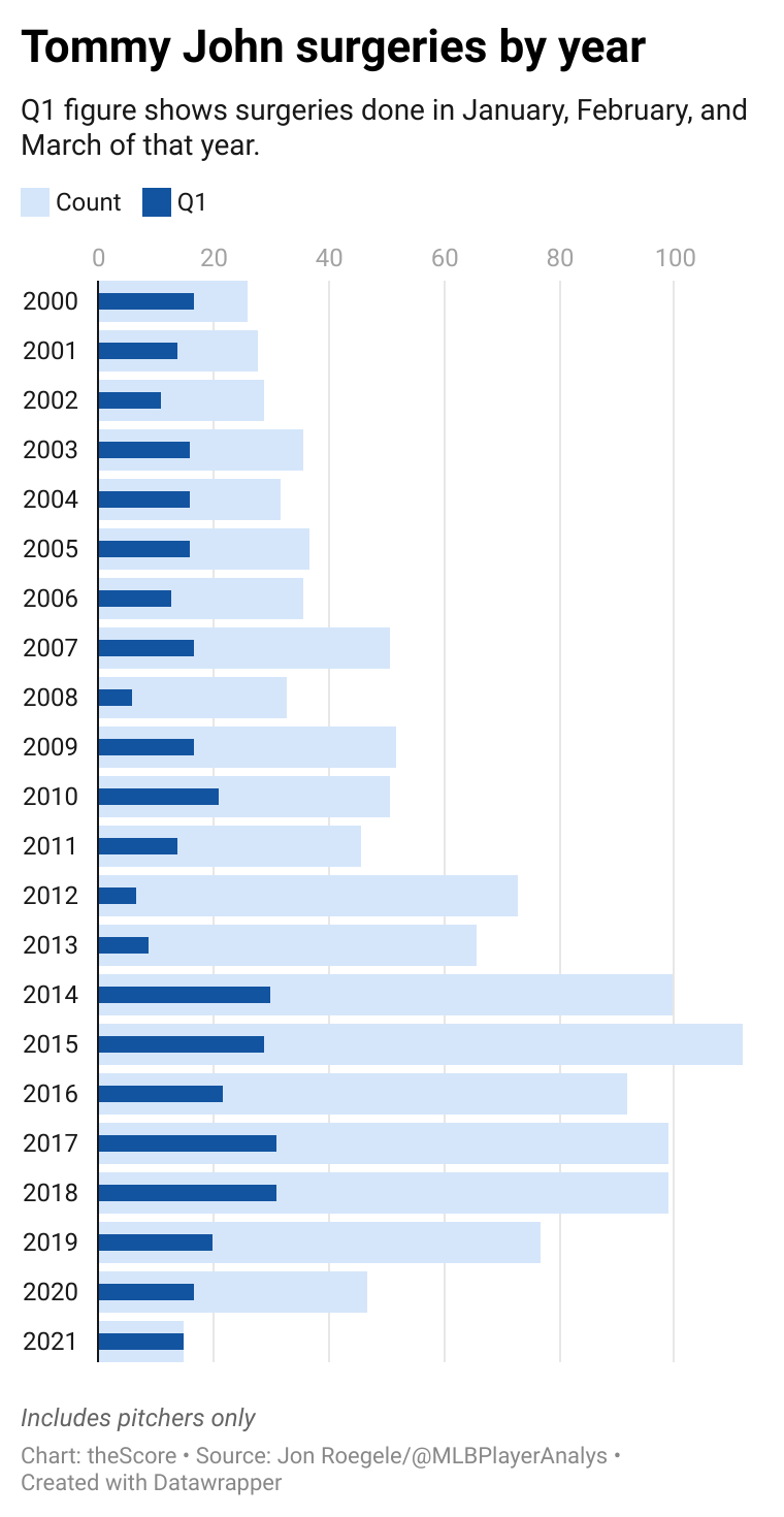 Moreover, the busiest time for elbow injuries requiring Tommy John surgery is in the first quarter of the year, and Tommy John surgeries through Tuesday were at their lowest first-quarter mark since 2012. Perhaps the industry is becoming better at training and managing arms. This season will provide a test.