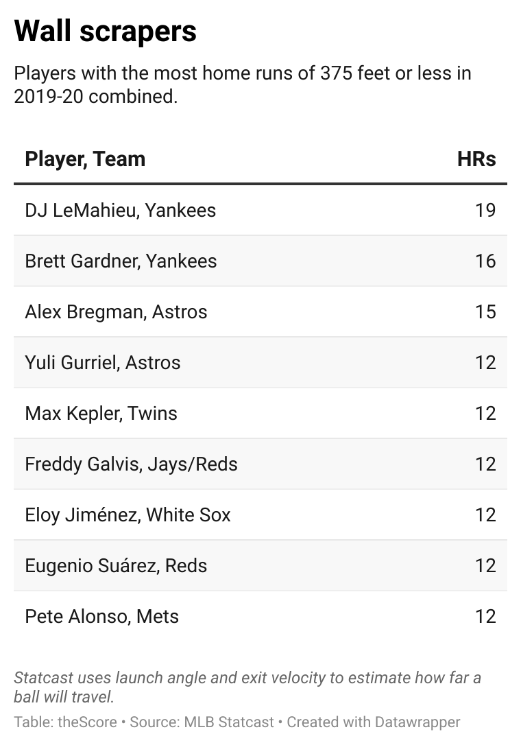 Two teams tied for the most home runs hit 375 feet or fewer the last two seasons: The Yankees and Astros each had 100 such home runs. The next closest team? The Reds with 73. So the Astros and Yankees are interesting outliers.