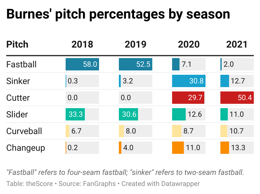 So in the spring of 2020, Burnes essentially took his four-seam grip and offset his hand slightly to the right of the ball. One of the best pitches in the majors was born - fast. He made a big improvement in the shortened season; his 8.82 ERA was down to 2.11 over 12 starts in 2020.