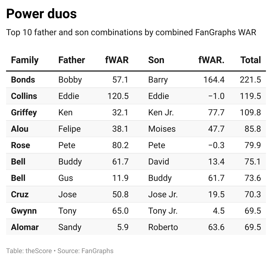 While there are outliers like Barry Bonds and Ken Griffey Jr. - sons who topped their father's careers in a big way - fathers have usually outperformed their children, according to Baseball Reference data analyzed by theScore. Of the 127 father-son pairings of position players entering the 2019 season, the dads averaged 14.2 career WAR while their sons averaged 8.1. Head to head, fathers held the edge, too, having the better career 74 times versus the sons' 48. There were also five ties.