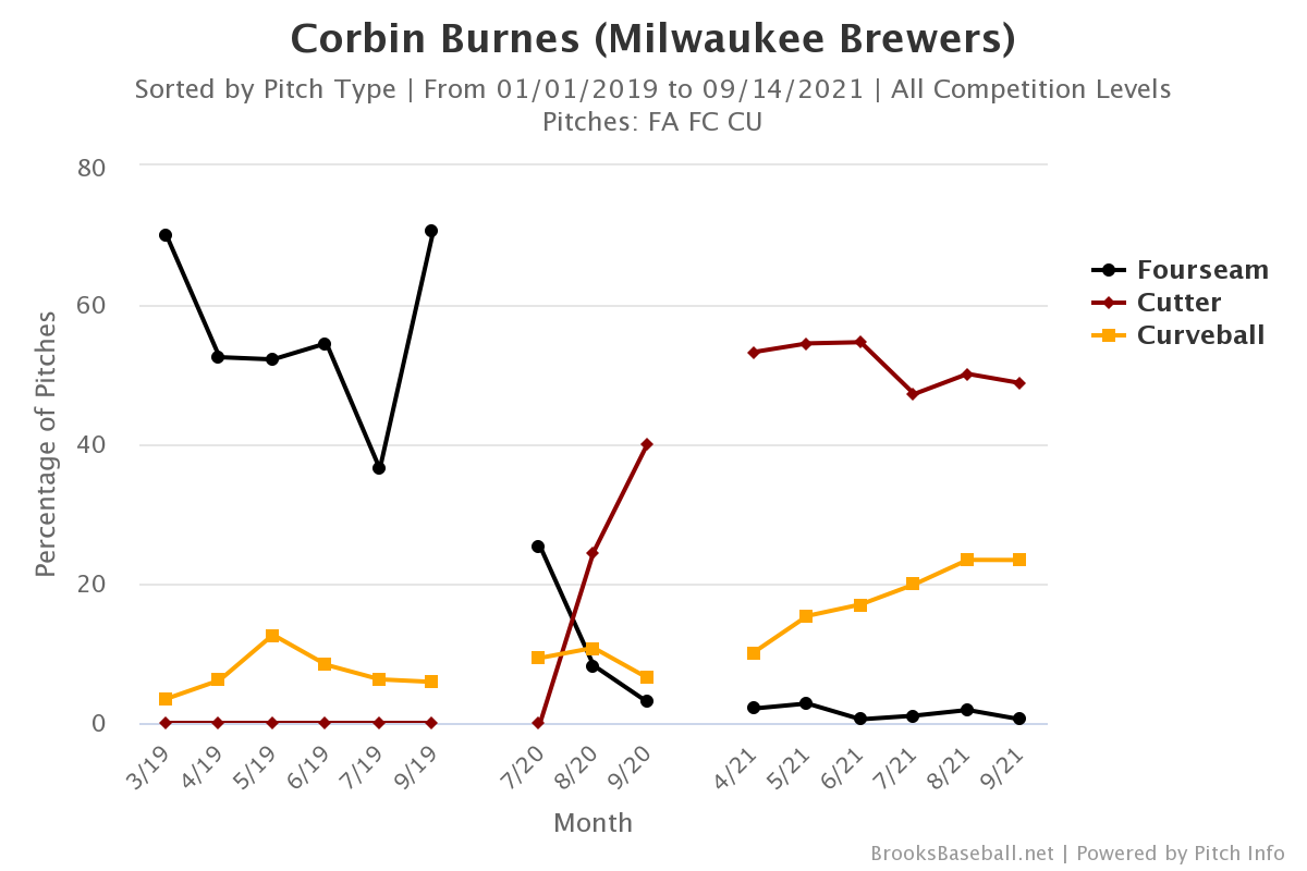 Last season, Burnes stopped throwing his four-seam fastball and replaced much of that usage with his cutter. He was the most improved pitcher in baseball in 2020. Burnes was even better early this season and - incredibly - he's kept improving even as baseball cracked down on sticky stuff and he suffered some spin decline.