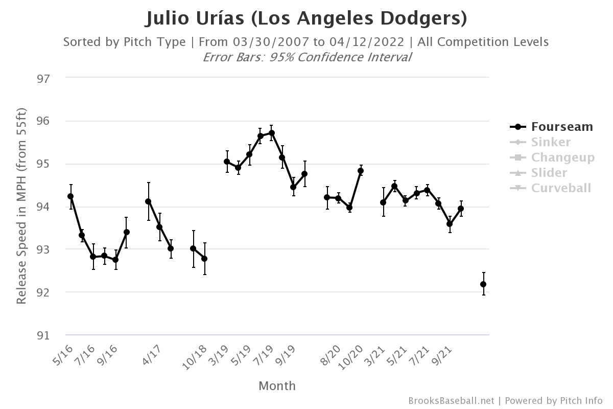 In Julio Urias' opening start for the Dodgers in Colorado - in which he lasted only two innings - he averaged 92.3 mph on his fastball. He's never averaged below 93 mph for a season and sat at 94 mph in 2021.