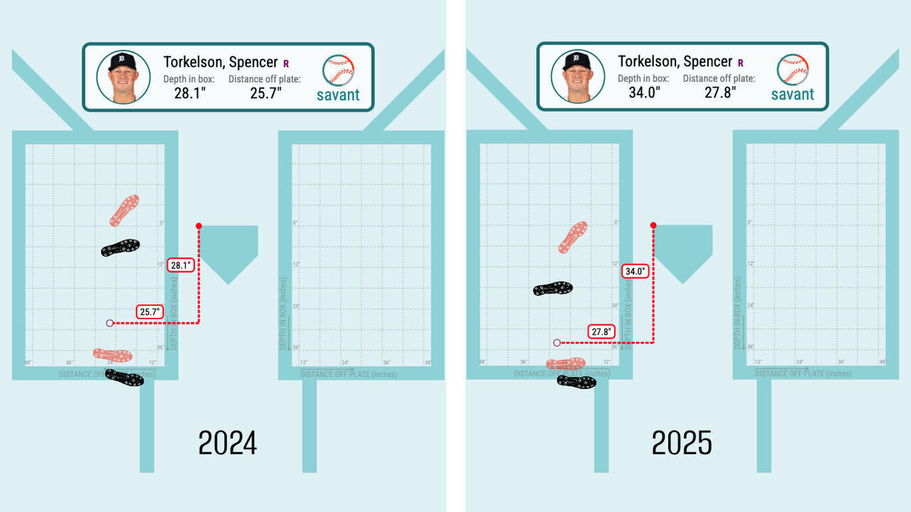 His early breakout coincides with a much deeper stance in the batter's box, about 5.8 inches deeper than last season, the fifth-biggest change among the 193 batters qualified and tracked over the last two seasons. The distance is measured from the front of home plate to the midpoint of the batter's stance. Perhaps allowing the ball to travel for those extra few milliseconds is contributing to Torkelson's excellent start.
