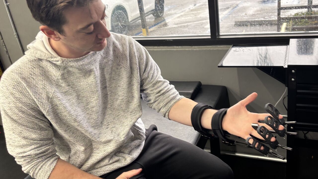 Inside this high-tech warehouse, Hejka instructed me to place each finger into separate compartments within the device. These compartments can adjust to isolate various segments and joints of the fingers: the tips, mid-finger, and proximal joints. Each grip slot is connected to the Wolverine-like rods, which are tied to sensors in the device.