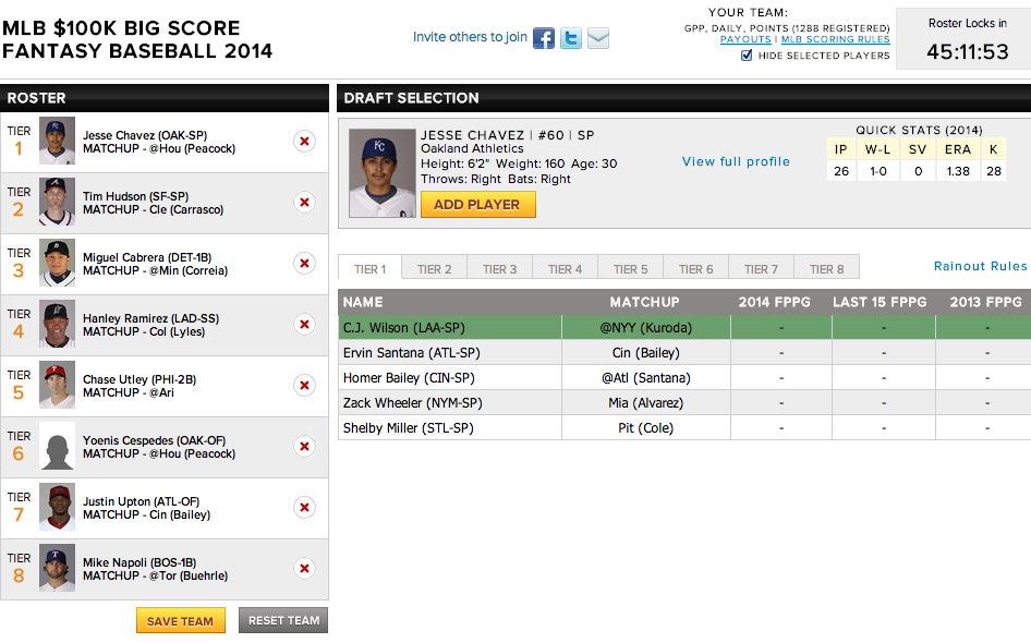 Here is an example of a roster for Friday’s $100,000 MLB Big Score