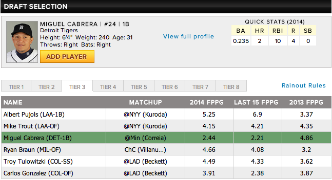 It is awfully tough to pass over Mike Trout under any circumstances, and Carlos Gonzalez against Josh Beckett is enticing as well. But Miguel Cabrera is heating up and just so happens to be the best hitter alive.