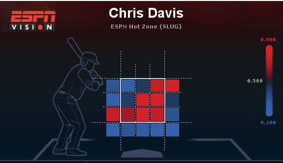 That is big time power, turning around 94 and hitting it a long way to center field. It is that kind of power and ability to take a ball where it is pitched that makes Davis so dangerous. The below image (courtesy of ESPN) shows just how well Davis is able to drive balls on the outer half of the plate.