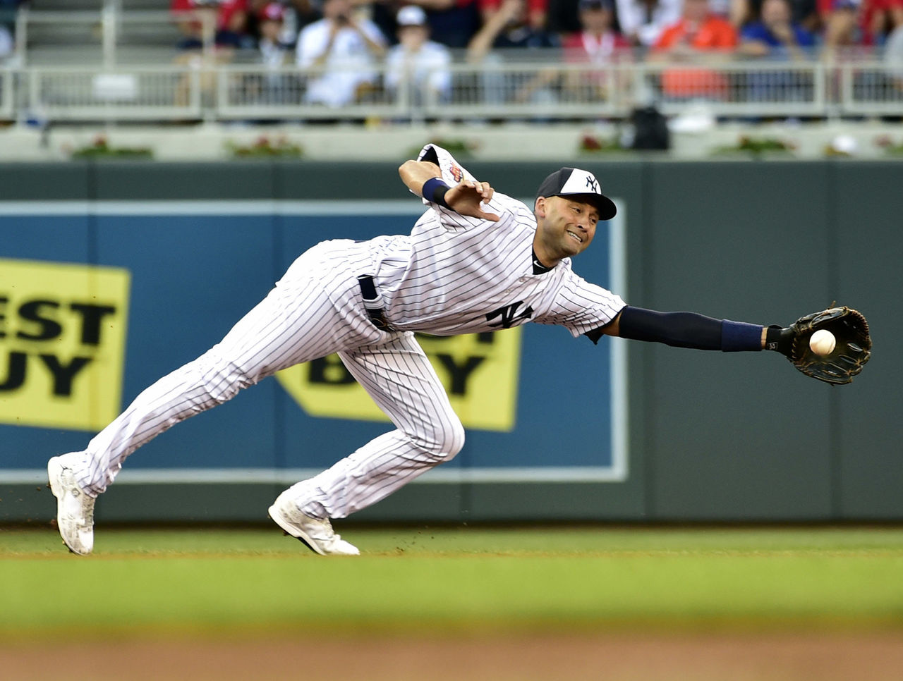 In the top of the first inning, Jeter nearly stole a single from NL MVP Andrew McCutchen, ranging deep to his left with a dive but coming up just a shade slow with the throw.