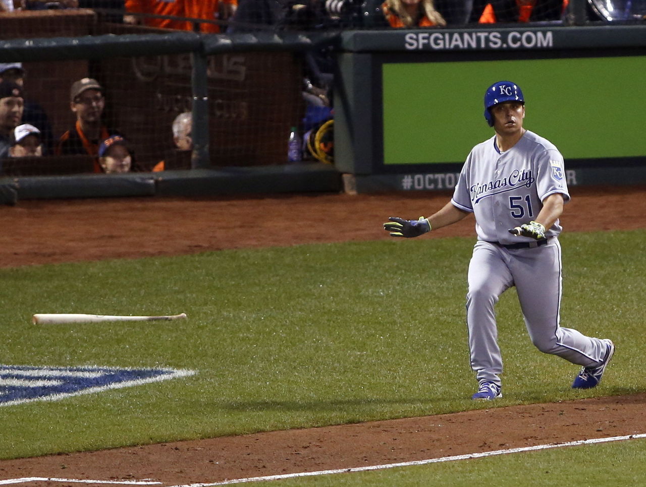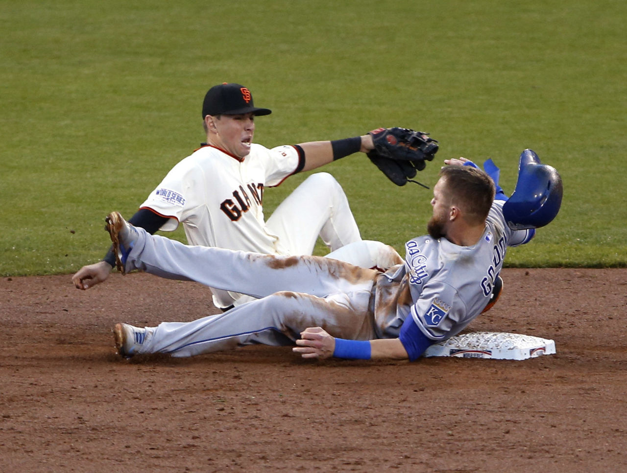 Alex Gordon collides with second baseman Joe Panik while attempting to steal second base in the third inning. The 30-year-old eventually scored on an infield single from Eric Hosmer.
