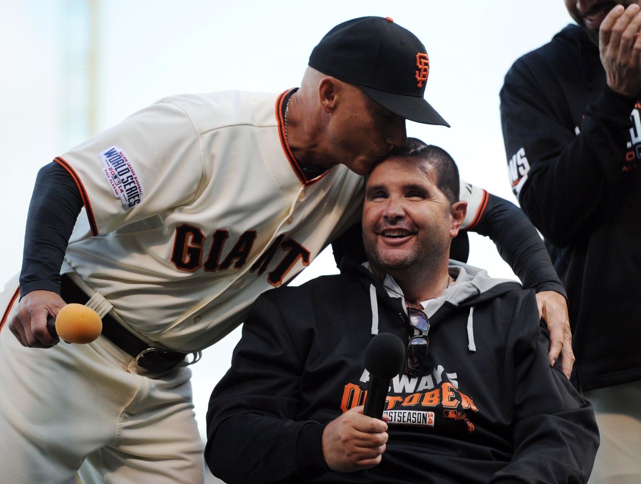 Third-base coach Tim Flannery plants a kiss on the head of Bryan Stow, the Giants fan left partially paralyzed after being brutally beaten outside Dodger Stadium on Opening Day of the 2011 season.