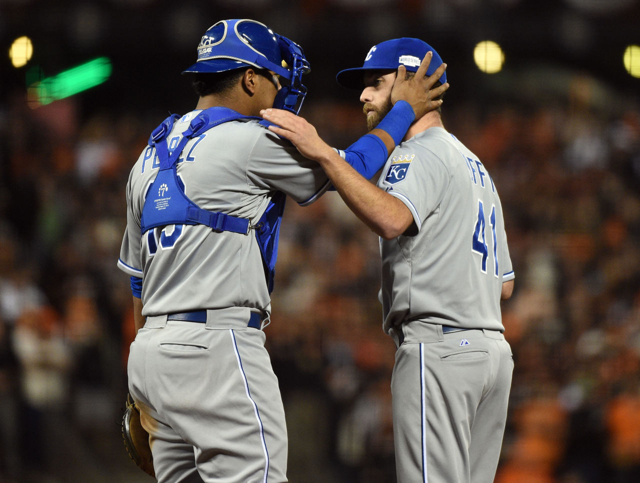 Salvador Perez encourages left-hander Danny Duffy, who was summoned in the fourth inning to quash a Giants rally after disappointing performances from Jason Vargas and Jason Frasor.