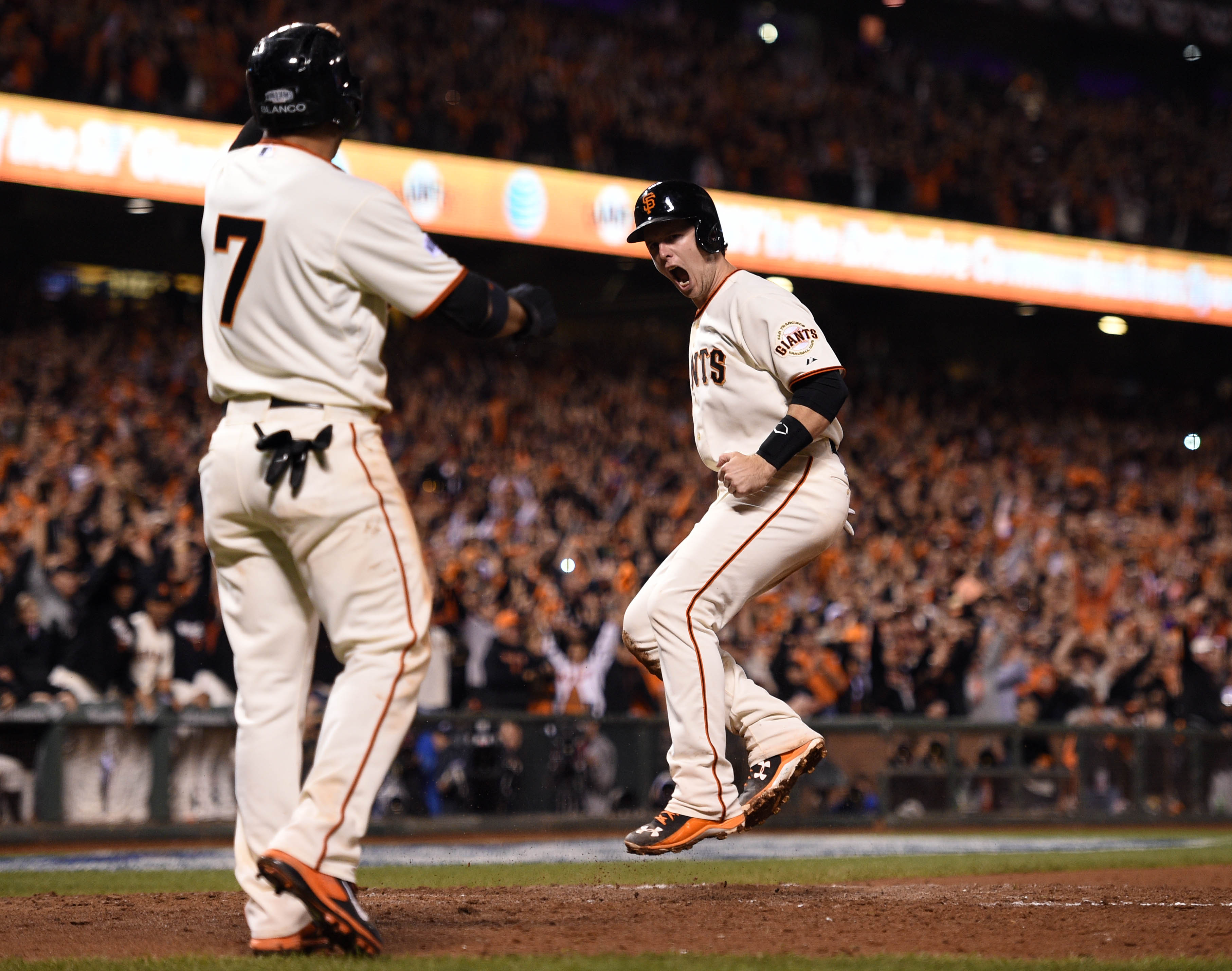 The typically reserved Buster Posey bellows at teammate Gregor Blanco after scoring on Pablo Sandoval's two-out single in the sixth that afforded the Giants a 6-4 lead.